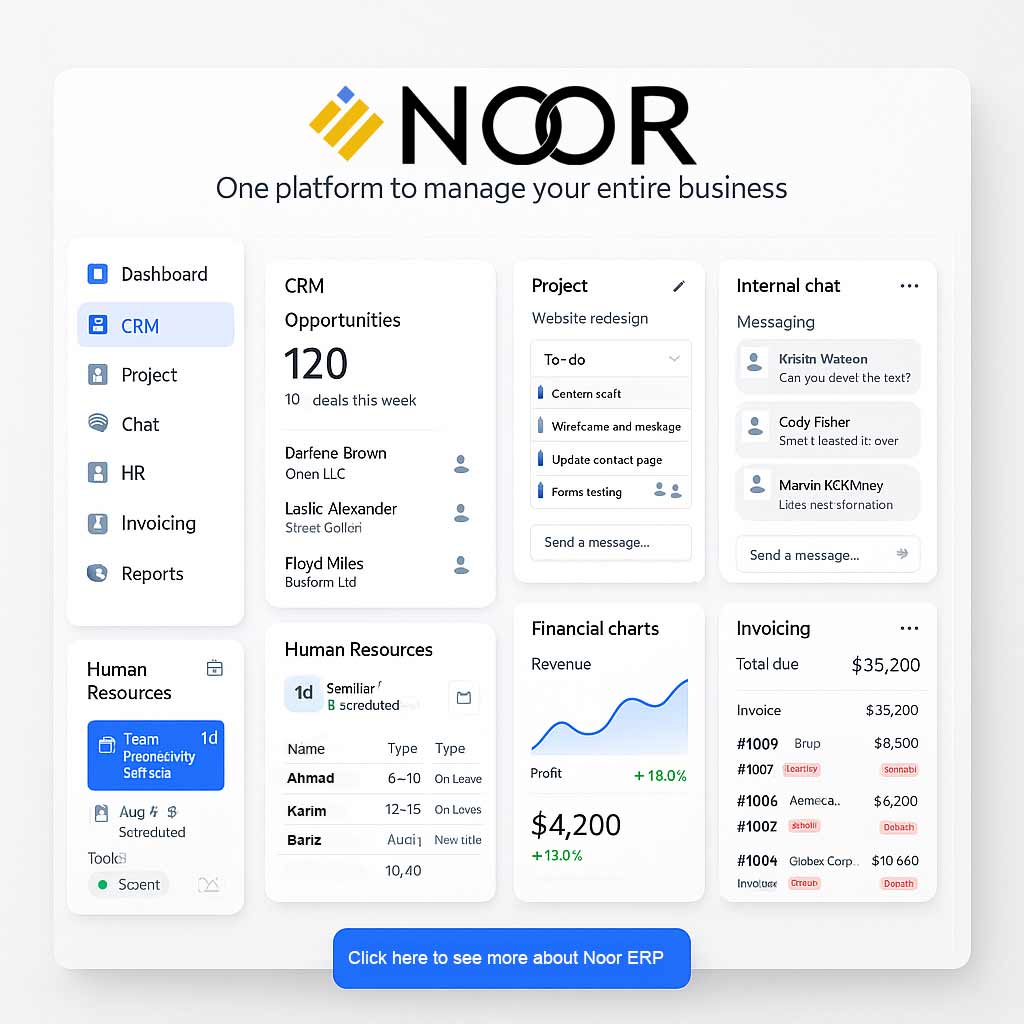 Noor System is an all-in-one business management platform that brings CRM, project management, internal chat, HR, invoicing, and financial management together in a single integrated system. Ready for a free consultation?